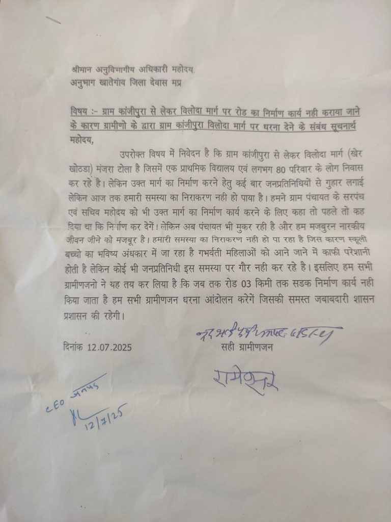 यह तस्वीर देवास जिले के खातेगांव जिला पंचायत अंतर्गत ग्राम कांजीपुरा से लेकर विलोदा मार्ग (खेर खोठडा) मंजरा टोला की है। जहां लंबे समय से प्राथमिक स्कूल का निर्माण कराया था, यहां करीबन 70 से अधिक परिवार के लोग निवास कर रहे है। पक्की सड़क का निर्माण करने के लिए अफसर से लेकर जिम्मेदारों के दफ्तर खटखाटाए लेकिन आज तक कच्ची सड़क की समस्या का समाधान नहीं हुआ है।