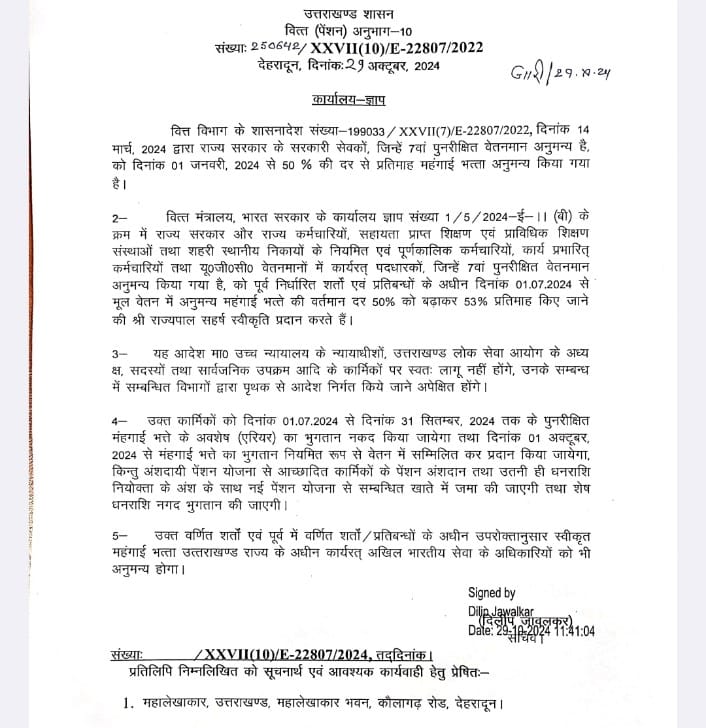 धामी सरकार के इस आदेश से करीब सवा लाख सरकारी कर्मचारियों को बोनस मिलेगा, जबकि करीब दो लाख सरकारी कर्मचारी और पेंशनर्स को 3 फीसदी डीए का लाभ होगा। महंगाई भत्ता बढ़कर 53 % हो गया है। प्रदेश सरकार ने इसका आदेश भी जारी कर दिया है।