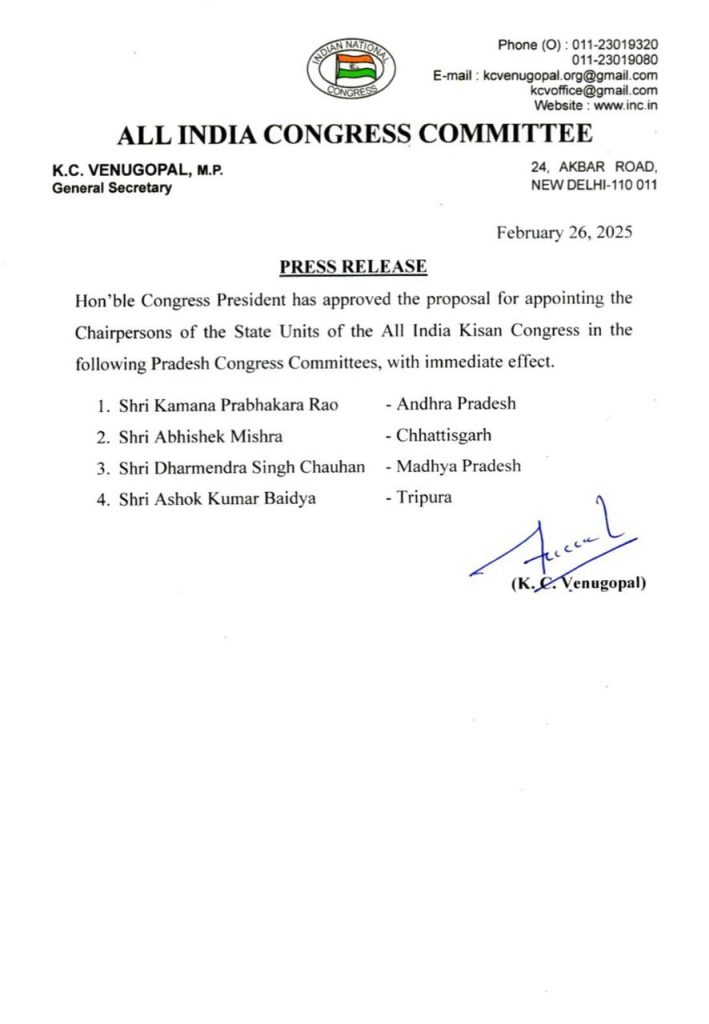 मध्य प्रदेश के अलावा छतीसगढ़, आंध्र प्रदेश और त्रिपुरा में भी किसान कांग्रेस प्रदेश अध्यक्ष की नेताओं को जिम्मेदारी सौंपी गई है।