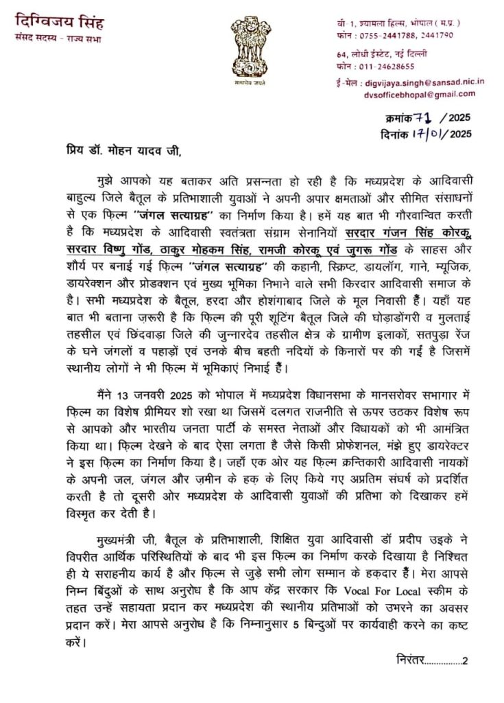 शब्बीर अहमद, भोपाल। पूर्व मुख्यमंत्री और वरिष्ठ कांग्रेस नेता दिग्विजय सिंह ने मुख्यमंत्री डॉ. मोहन यादव को पत्र लिखा है। इसमें उन्होंने जंगल सत्याग्रह फिल्म को टैक्स फ्री किए जाने की मांग की है। दिग्विजय ने पत्र में फिल्म को सेंसर बोर्ड से पास कराये जाने की भी मांग की है। यह मूवी आदिवासी समाज पर बनी है।