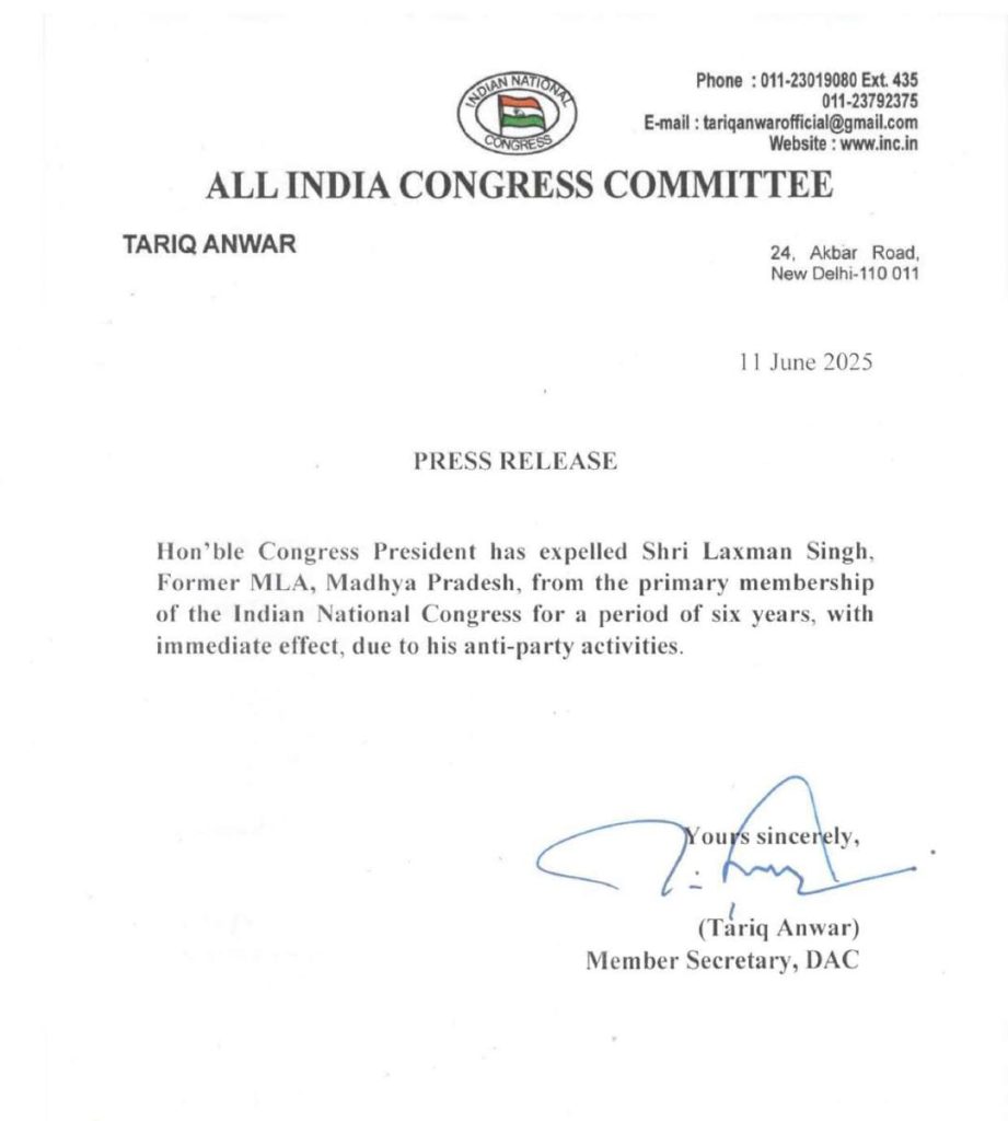 सुधीर दंडोतिया, भोपाल। मध्य प्रदेश के पूर्व सीएम दिग्विजय सिंह के भाई और दिग्गज कांग्रेस नेता लक्ष्मण सिंह को कांग्रेस ने निष्कासित कर दिया है। 6 साल के लिए उन्हें पार्टी से बाहर कर दिया है। बता दें कि लल्लूराम डॉट कॉम ने पहले ही बता दिया था कि लक्ष्मण सिंह 6 साल के लिए पार्टी से निष्कासित किए जा सकते हैं।