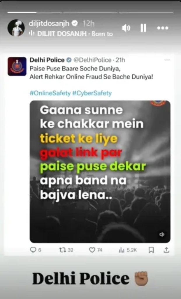 दिल्ली पुलिस के ऑफ़िशियल X हैंडल ने दिलजीत के मशहूर गाने बॉर्न टू शाइन पर आधारित एक कॉन्सर्ट का वीडियो शेयर किया. वीडियो में लिखा- गाना सुनने के चक्कर में टिकट के लिए ग़लत लिंक पर पैसे देकर अपना बैंड न बजाना. कैप्शन में लिखा, पैसे-पुसे बारे सोचे दुनिया, अलर्ट रहकर ऑनलाइन फ्रॉड से बचे दुनिया