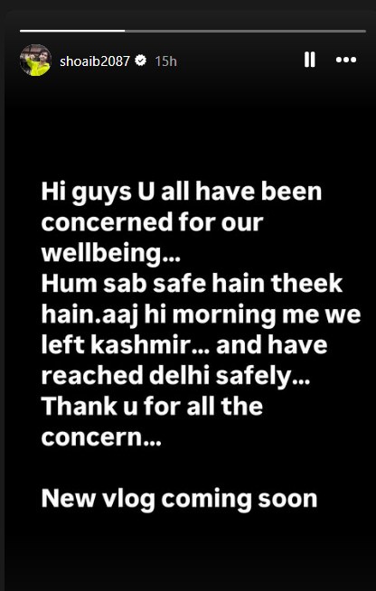 बता दें कि पहलगाम में मंगलवार को हुई इस घटना के बाद से उनके फैंस काफी परेशान हो गए थे. वहीं, अब कपल ने एक पोस्ट शेयर कर फैंस को अपडेट दिया है. शोएब इब्राहिम (Shoaib Ibrahim) ने अपने इंस्टाग्राम पर स्टोरी शेयर करते हुए लिखा- दोस्तों आप हमारे लिए काफी चिंतित थे. हम सब सुरक्षित हैं और सुबह ही हम कश्मीर से निकले हैं और दिल्ली सही सलामत पहुंच गए हैं. आपकी चिंता के लिए धन्यवाद. हमारा नया व्लॉग जल्द ही आ रहा है.
