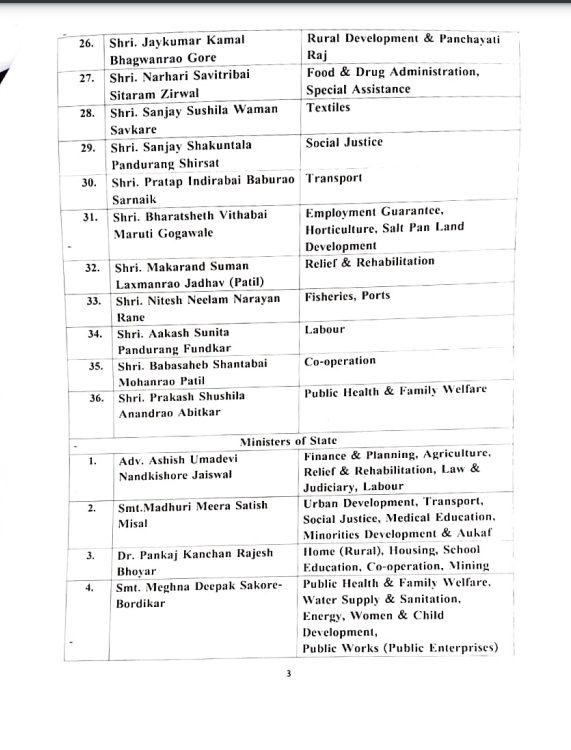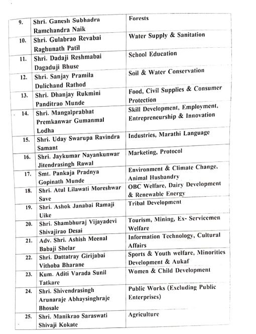 मंत्री माणिकराव कोकाटे को कृषि विभाग दिया गया है. पर्यावरण जलवायु परिवर्तन मंत्री पंकजा मुंडे के भाई धनंजय मुंडे को खाद्य एवं नागरिक आपूर्ति विभाग की जिम्मेदारी दी गई है. वहीं अशोक उइके को आदिवासी विकास, आशीष शेलार को आईटी और संस्कृति विभाग तथा शिवसेना के उदय सामंत को उद्योग संभालेंगे.