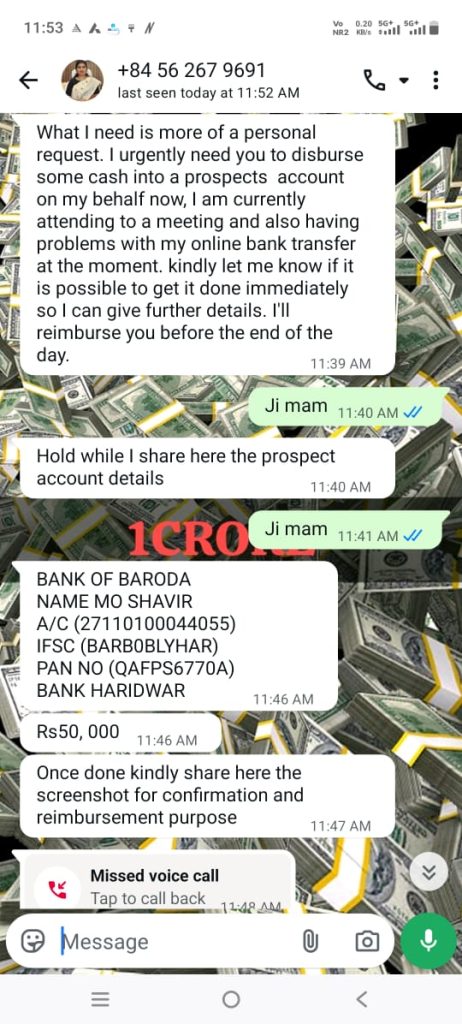 जानकारी के अनुसार, ठग मोबाइल नंबर +84 562679691 के जरिए कलेक्टर के नाम का दुरुपयोग कर धनराशि की मांग कर रहा है। संबंधित बैंक खाते में दर्ज नाम मो. शवीर बताया गया है, जिसका अकाउंट नंबर 27110100044055 और IFSC कोड BARBOBLYHAR है।