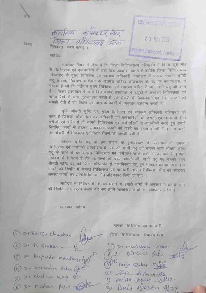 पुरुषोत्तम पात्र, गरियाबंद. CMHO दफ्तर में हो रहे कांड के रोजाना खुलासे हो रहे हैं. इसी बीच स्वास्थ्य विभाग का एक और नया मामला सामने आया है। जिला अस्पताल में पदस्थ 63 अधिकारियों-कर्मचारियों ने हस्ताक्षर कर कलेक्टर के नाम एक शिकायत और मांग पत्र सौंपा है, जिसमें कहा गया है कि सीएमएचओ की छोटी बहन सृष्टि यदु वहां एनएचएम में तम्बाकू नियंत्रक सलाहकार पद पर पदस्थ हैं. यह ग्रेड 3 की श्रेणी में आता है। इनकी जवाबदारी राष्ट्रीय कार्यक्रम के लिए है पर वे अनाधिकृत रूप से जिला अस्पताल में अपना रौब दिखा रही.