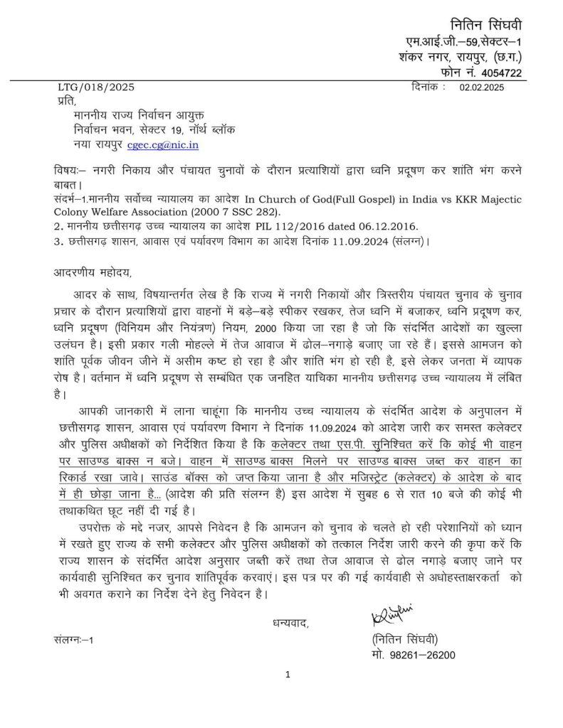 सत्या राजपूत, रायपुर. नगरीय निकाय और पंचायत चुनाव के दौरान प्रत्याशियों द्वारा ध्वनि प्रदूषण कर शान्ति भंग करने की शिकायत राज्य निर्वाचन आयुक्त से की गई है. शिकायत में कहा गया कि चुनाव प्रचार के लिए गली-मोहल्ले में तेज आवाज में ढोल-नगाड़े बजाने के साथ लाउडस्पीकर का इस्तेमाल किया जा रहा हैं. नितिन सिंघवी ने अपनी शिकायत में आवास एवं पर्यावरण विभाग के आदेश का पालन कराने की मांग की है.