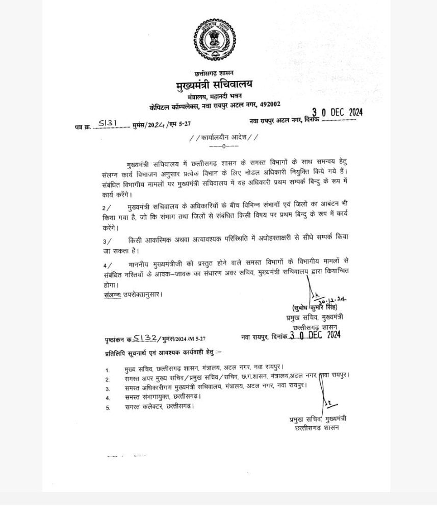 प्रमुख सचिव सुबोध सिंह द्वारा जारी आदेश के अनुसार, कुछ विभाग खुद सुबोध सिंह ने अपने पास रखे हैं. वहीं पांचों संभाग के लिए प्रभारियों की नियुक्त की गई है.