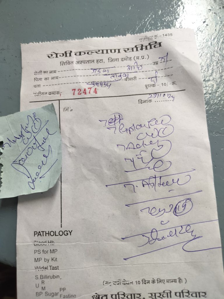 बाहर के मेडिकल स्टोर की लिखी आधा दर्जन पर्ची दिखाई