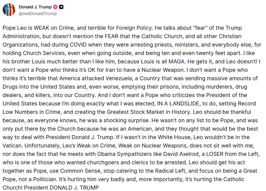 ट्रंप ने पोप लियो के भाई लुईस की तारीफ की और कहा कि मुझे उनका भाई लुई उनसे कहीं ज्यादा पसंद है, क्योंकि लुईस पूरी तरह से MAGA समर्थक हैं. उन्हें बात समझ आती है, पर लियो को नहीं! उन्होंने कहा कि मुझे ऐसा पोप नहीं चाहिए जो ईरान के पास परमाणु हथियार होने को जायज समझे। मुझे ऐसा पोप नहीं चाहिए जो यह सोचे कि अमेरिका द्वारा वेनेजुएला पर हमला करना भयानक था, जो भारी मात्रा में ड्रग्स, अपराधियों, ड्रग डीलरों को अमेरिका भेजने से कृत्यों में शामिल था। मुझे ऐसा पोप नहीं चाहिए जो संयुक्त राज्य अमेरिका के राष्ट्रपति की आलोचना करे, क्योंकि मैं वही कर रहा हूं, जिसके लिए मुझे भारी बहुमत से चुना गया था- अपराध दर को रिकॉर्ड निचले स्तर पर लाना और इतिहास का सबसे बड़ा शेयर बाजार बनाना।