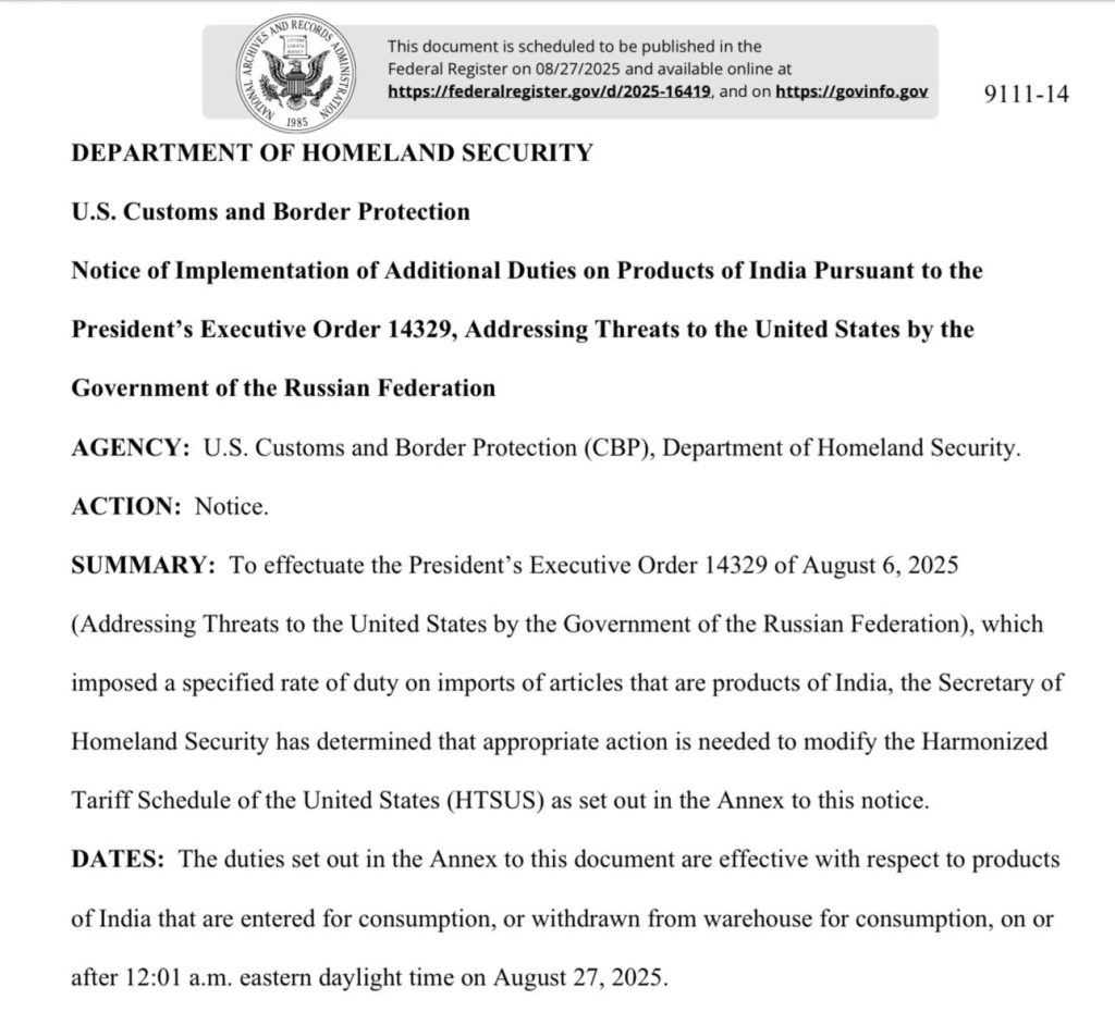 US Tariff On India: भारत पर 50 प्रतिशत अमेरिकी टैरिफ (50 percent US tariff on India) लगाने की राष्ट्रपति डोनाल्ड ट्रंप (Donald Trump) की डेडलाइन खत्म हो गई है। ट्रंप ने 27 अगस्त से 50 प्रतिशत टैरिफ लगाने का ऐलान किया था। इसमें 25 प्रतिशत टैरिफ और 25 प्रतिशत रूस से तेल खरीदने को लेकर रेसिप्रोकल टैरिफ (पेनाल्टी) लगाया है। 27 अगस्त होने में चंद घंटे बचे हुए है। इसके बाद भारत पर 50 प्रतिशत अमेरिकी टैरिफ लागू हो जाएगा। अमेरिका ने भारत से आयातित वस्तुओं पर 25% अतिरिक्त टैरिफ लगाने की औपचारिक अधिसूचना भी जारी कर दी है।