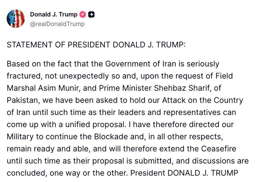 ट्रंप ने सीजफायर एक्सटेंशन का ऐलान करते हुए कहा कि ईरान के अंदर इस समय नेतृत्व और सरकार में एकजुटता नहीं है। ऐसे वक्त में पाकिस्तानी पीएम शहबाज शरीफ और आर्मी चीफ ने उनसे ईरान पर कुछ समय तक हमले रोकने की अपील की, ताकि ईरान को साझा प्रस्ताव तैयार करने का वक्त मिल सके। अमेरिकी राष्ट्रपति ने कहा कि इस अपील को मानते हुए उन्होंने अमेरिकी सेना को फिलहाल हमला रोकने का आदेश दिया है। हालांकि, सेना को पूरी तरह तैयार रहने को भी कहा गया है और ईरान पर दबाव बनाए रखने के लिए नाकेबंदी (ब्लॉकेड) जारी रहेगी।