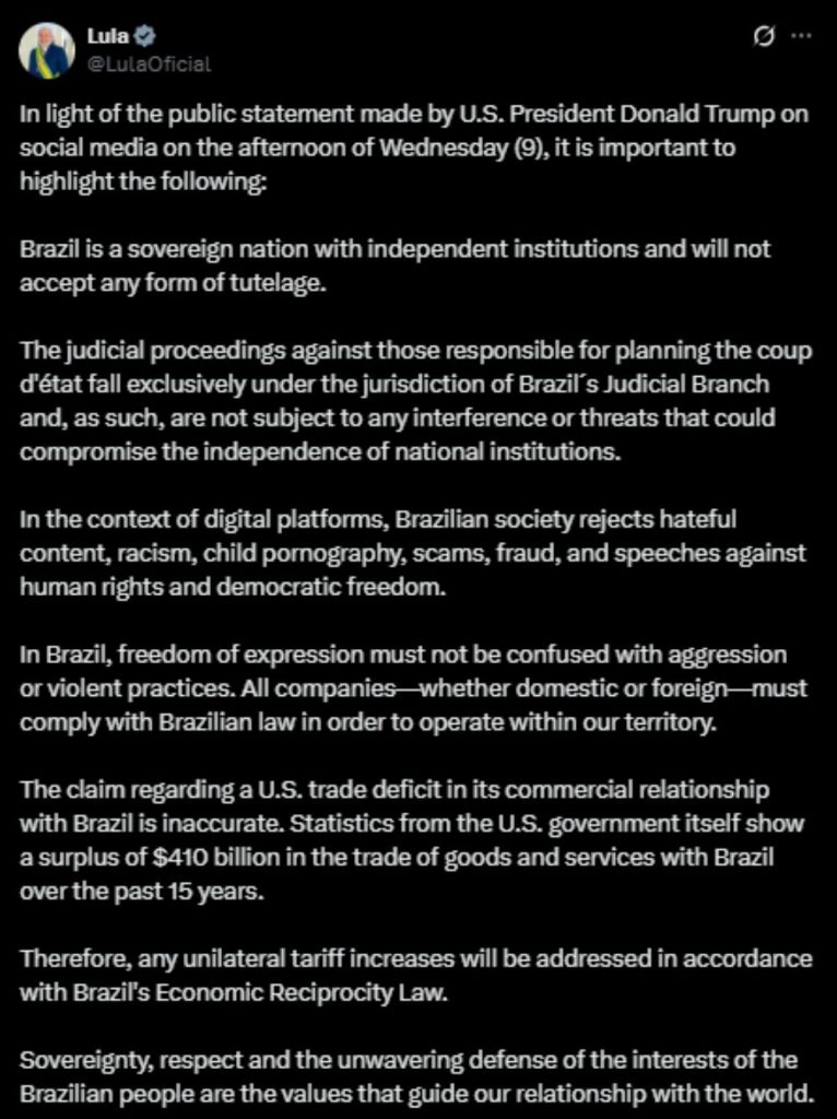 ट्रंप की घोषणा के बाद लूला ने सोशल मीडिया प्लेटफॉर्म X पर प्रतिक्रिया दी। उन्होंने साफ शब्दों में कहा कि ब्राजील एक स्वतंत्र और संप्रभु राष्ट्र है और वह किसी अन्य देश की दखलअंदाजी स्वीकार नहीं करेगा। उन्होंने लिखा, ‘ब्राजील एक संप्रभु देश है, जिसकी अपनी स्वतंत्र संस्थाएं हैं। हम किसी भी प्रकार का बाहरी दखल स्वीकार नहीं करेंगे।