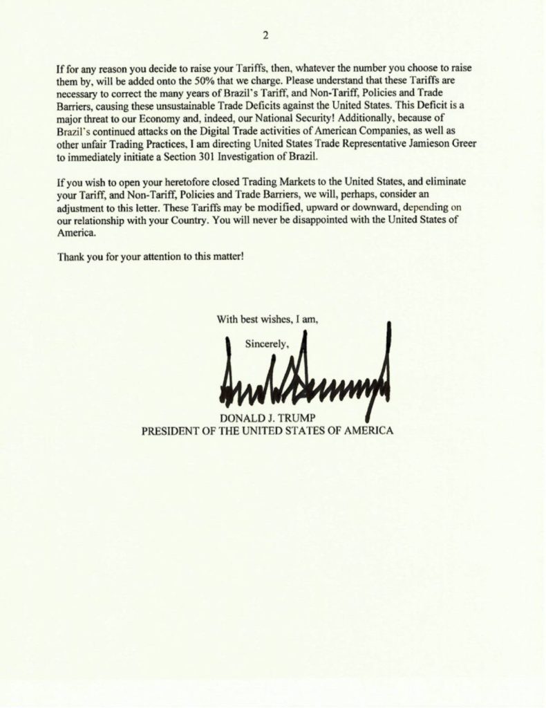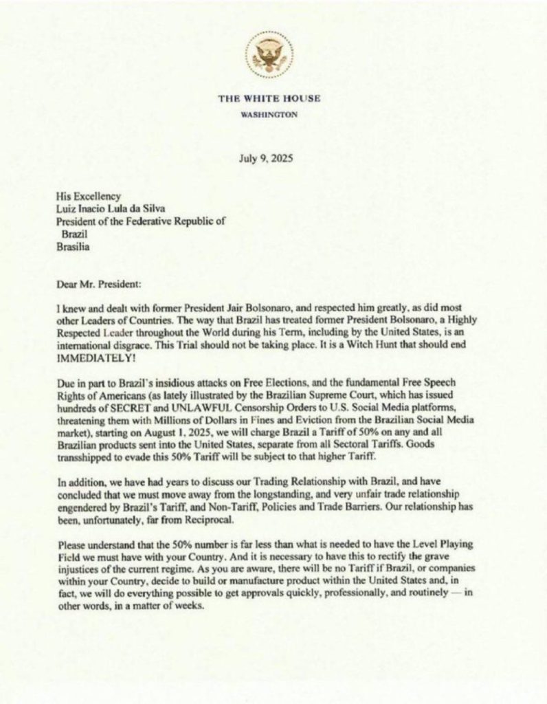 ट्रंप ने राष्ट्रपति लूला को एक चिट्ठी भी लिखी। इसमें उन्होंने कहा कि वे पूर्व ब्राजीलियाई राष्ट्रपति जेयर बोलसोनारो को जानते हैं और उनका सम्मान करते हैं। ट्रंप ने बोलसोनारो के खिलाफ चल रही सुनवाई को राजनीतिक साजिश बताया और कहा कि यह नहीं होनी चाहिए। ट्रंप ने अपने पत्र में लिखा, “मैं पूर्व राष्ट्रपति बोलसोनारो को जानता हूं, उनके साथ काम किया है और उनका बहुत सम्मान करता हूं, जैसा कि दुनिया के अधिकतर नेता करते हैं। ब्राजील ने जिस तरह बोलसोनारो के साथ व्यवहार किया है, वह एक अंतरराष्ट्रीय शर्मिंदगी है। यह मुकदमा नहीं चलना चाहिए। यह एक ‘विच हंट’ है जिसे तुरंत बंद किया जाना चाहिए।