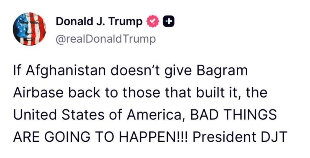 अमेरिका के राष्ट्रपति डोनाल्ड ट्रंप ने अपने सोशल मीडिया प्लेटफॉर्म ट्रुथ सोशल पर एक पोस्ट के जरिए अफगानिस्तान की तालिबान सरकार को खुली धमकी दी है। उन्होंने कहा कि अगर अफगानिस्तान बगराम एयरबेस को उसके निर्माता यानी संयुक्त राज्य अमेरिका को वापस नहीं करता, तो इसके नतीजे बहुत बुरे होंगे।