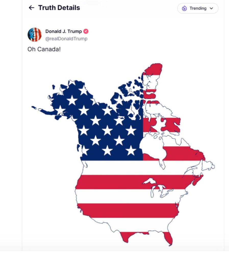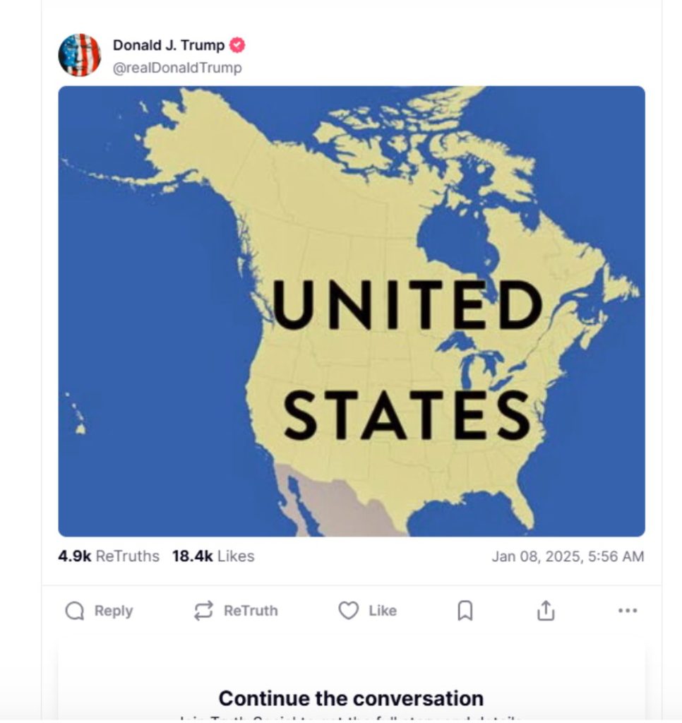 दरअसल डोनाल्ड ट्रंप ने मंगलवार को कनाडा को संयुक्त राज्य अमेरिका में मिलाने के लिए ‘आर्थिक ताकत’ के इस्तेमाल की धमकी देने के कुछ घंटों बाद,अमेरिकी ध्वज से चित्रित दोनों देशों को एक दिखाने वाला मैप भी शेयर किया। ट्रम्प ने मैप को शेयर करचे हुए ‘स्टेट ऑफ USA’ लिखा (State of USA)। ट्रंप ने कनाडा को अपने 51वें राज्य के रूप में अमेरिका में शामिल करने की इच्छा जाहिर की है।