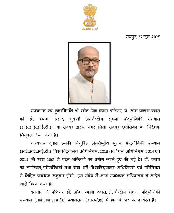 सत्यपाल सिंह राजपूत, रायपुर। राज्यपाल एवं कुलाधिपति रमेन डेका ने प्रोफेसर डॉ. ओम प्रकाश व्यास को नवा रायपुर स्थित डॉ. श्यामा प्रसाद मुखर्जी अंतर्राष्ट्रीय सूचना प्रौद्योगिकी संस्थान (IIIT) का निदेशक नियुक्त किया है. यह नियुक्ति भर्ती में गड़बड़ी और भ्रष्टाचार की शिकायतों के बीच पीके सिन्हा के कुलपति व निदेशक के पद से इस्तीफा देने के बाद की गई है.