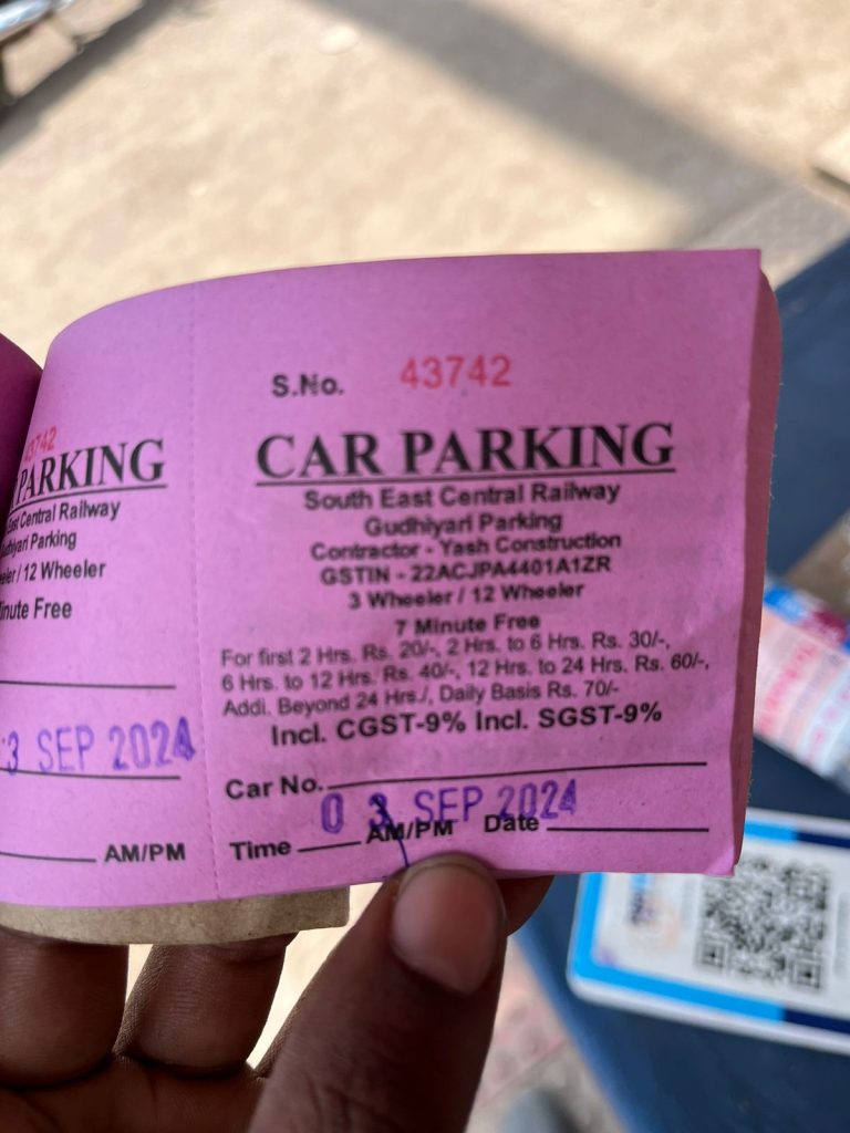रायपुर. Pratik Chauhan. कमर्शियल विभाग के अधिकारी संभवतः काफी व्यस्त है. यही कारण है कि रायपुर रेलवे स्टेशन (Raipur Railway Station) के गुढ़ियारी की तरफ की पार्किंग में ‘फ्री पार्किंग’ वाले बोर्ड आपको ढ़ुढ़ने के बाद भी नहीं मिलेगा. पर्ची में 3 व्हीलर और 12 व्हीलर के लिए 7 मिनट Free का जिक्र है. अब सवाल ये है कि ये गलती से 2 व्हीलर के जगह 12 व्हीलर प्रिंट हुआ है या 12 व्हीलर इसलिए लिखा गया कि 2 व्हीलर ग्राहकों को पहले न दिखे. ऐसा क्यों हुआ ये रेलवे अधिकारियों के लिए जांच का विषय है.
