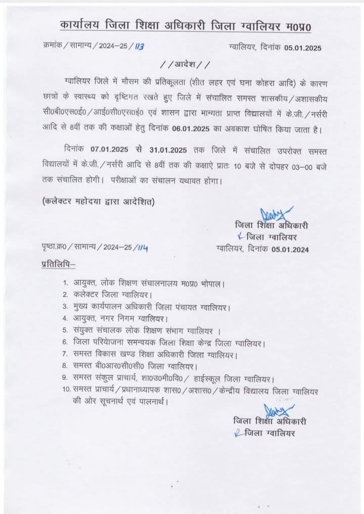 इधर, ग्वालियर में भी स्कूलों के समय में बदलाव किया गया है। जिले में केजी/नर्सरी से कक्षा 8वीं तक की कक्षाओं में कल 6 जनवरी को अवकाश घोषित किया गया है। वहीं 7 जनवरी से 31 जनवरी 2025 तक केजी/नर्सरी से कक्षा 8वीं तक की क्लास सुबह 10 बजे से दोपहर 3 बजे तक संचालित की जाएंगी। वहीं परीक्षाओं का संचालन यथावत रहेगा।