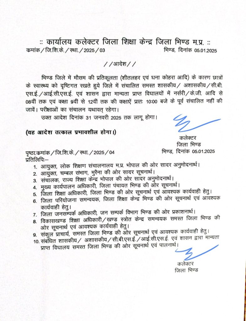 भिंड में शीतलहर के कारण कक्षा केजी से लेकर कक्षा 12वीं तक विद्यालयों के समय में परिवर्तन हुआ है। वर्तमान में शीतलहर के कारण भिण्ड जिले में तापमान गिर रहा है। इसीलिए छात्र-छात्राओं की सुरक्षा को दृष्टिगत रखते हुये जिला अन्तर्गत संचालित सभी शासकीय, अर्द्ध शासकीय, निजी विद्यालयों के कक्षा के.जी. नर्सरी से लेकर कक्षा 12वीं तक के छात्रों को सुबह की पाली में संचालित किये जाने वाले विद्यालयों का समय सुबह 10 बजे के बांद संचालित किए जाएंगे। परीक्षाओं का संचालन यथावत रहेगा। यह आदेश 31 जनवरी 2025 तक लागू रहेगा।
