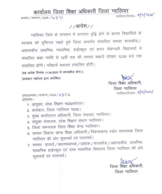 प्रदेश में भीषण गर्मी का असर दिखना शुरू हो गया है। ग्वालियर में बढ़ते हुए तापमान को देखते हुए स्कूलों के समय में बदलाव किया गया है। अब नर्सरी से लेकर 12वीं तक की कक्षाएं दोपहर 12 बजे तक ही लगाई जा सकेंगी। कलेक्टर रुचिका चौहान के निर्देश पर जिला शिक्षा अधिकारी अजय कटियार ने आदेश जारी कर दिया है।