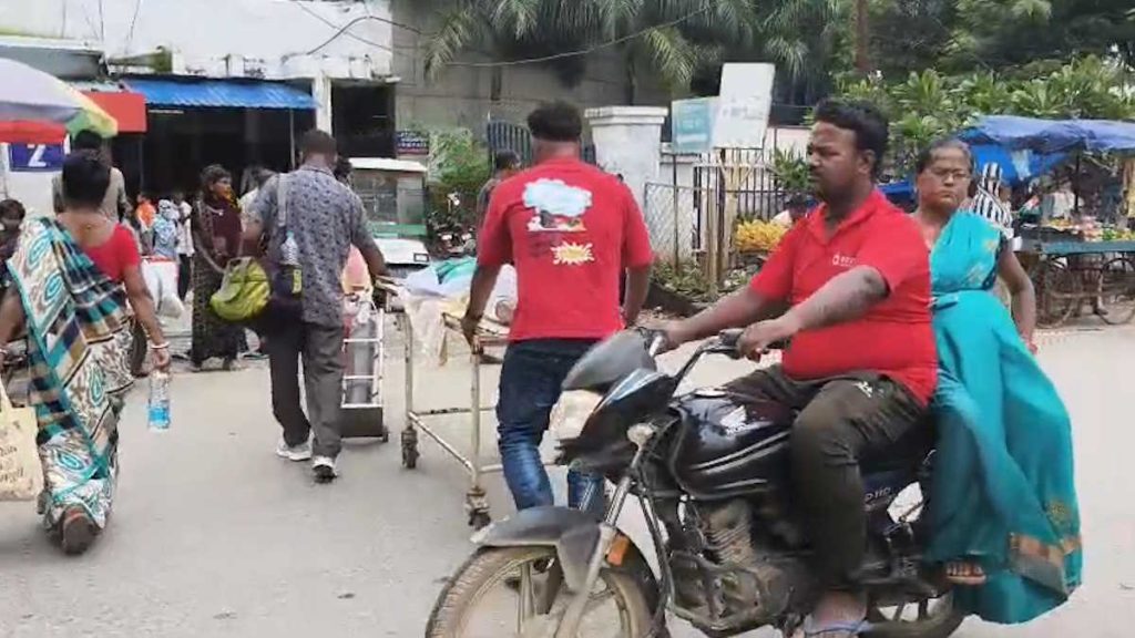 एक महिला मरीज को समय पर एंबुलेंस नहीं मिलने के कारण मेडिकल कॉलेज अस्पताल के नकीपुरिया वार्ड से अस्पताल के दूसरे हिस्से में सड़क पार कर स्ट्रेचर में ले जाया जा रहा है. साथ में मरीज को लगे ऑक्सीजन सिलेंडर को लेकर अस्पताल की महिला कर्मचारी चल रही है. तो परिवार के दूसरे सदस्य स्ट्रेचर को धकेल कर आगे बढ़ा रहे हैं.