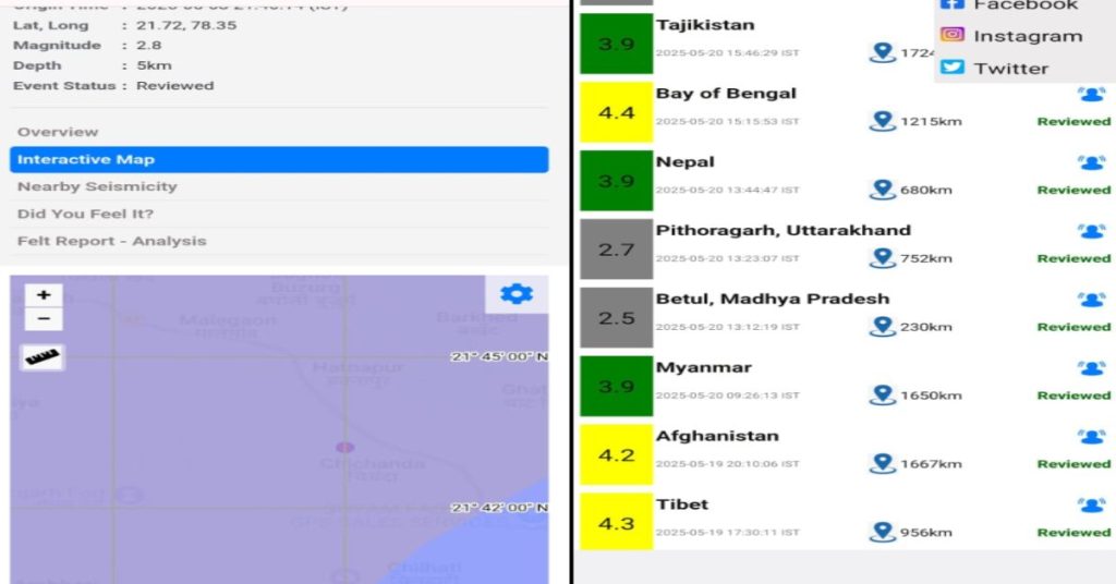 अमित कोड़ले, बैतूल। मध्य प्रदेश के बैतूल में भूकंप के झटके महसूस किए गए है। आधी रात को लोग घबराकर घरों से बाहर निकल गए। भूकंप की रिक्टर स्केल पर तीव्रता 2.8 मापी गई। इसका केंद्र जमीन से पांच किलोमीटर की गहराई में था।