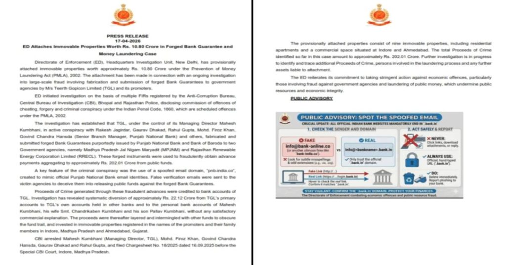 शब्बीर अहमद, भोपाल। फर्जी बैंक गारंटी के मामले में प्रवर्तन निदेशालय (ED) ने बड़ी कार्रवाई की है। 202 करोड़ धोखाधड़ी मामले में 10 करोड़ की अचल संपत्ति अटैच की है। यह एक्शन मनी लॉन्ड्रिंग के तहत लिया गया है। पीएनबी के नाम पर स्पूफ ईमेल से धोखाधड़ी की गई थी।
