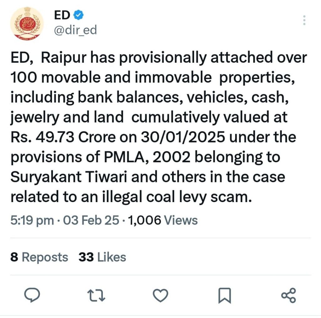 ईडी ने अपने ट्वीट में कहा, ईडी रायपुर ने अवैध कोयला लेवी घोटाले से संबंधित मामले में सूर्यकांत तिवारी और अन्य से संबंधित पीएमएलए, 2002 के प्रावधानों के तहत 30/01/2025 को कुल मिलाकर 49.73 करोड़ रुपये मूल्य की 100 से अधिक चल और अचल संपत्तियों को अनंतिम रूप से कुर्क किया है, जिसमें बैंक बैलेंस, वाहन, नकदी, आभूषण और जमीन शामिल हैं.