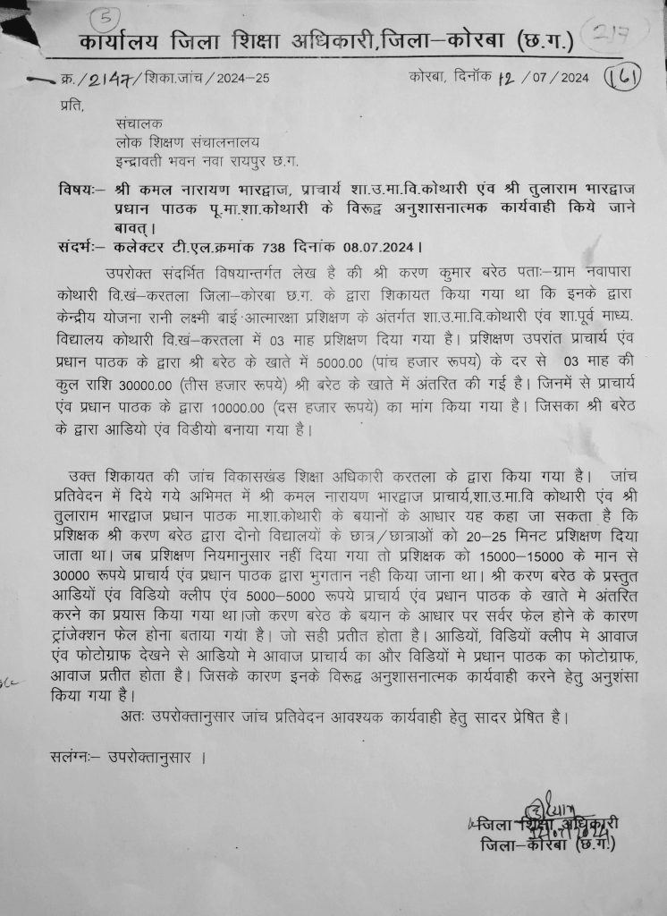बात हो रही है शासकीय उच्चतर माध्यमिक विद्यालय कोथारी के प्राचार्य कमल नारायण भारद्वाज और पूर्व माध्यमिक शासकीय कोथारी प्रधानपाठक तुलाराम भारद्वाज की. केंद्रीय योजना रानी लक्ष्मीबाई आत्मरक्षा प्रशिक्षण में रिश्वत मांगने का आरोप लगा था. प्रशिक्षक करण बरेठ ने रिश्वत मांगने के आडियो-वीडियो के साथ की गई शिकायत पर करतला विकास खंड शिक्षा अधिकारी ने जांच की थी. जांच में दोषी पाए जाने के बाद भी विभाग अब तक कार्रवाई नहीं कर पाया है.