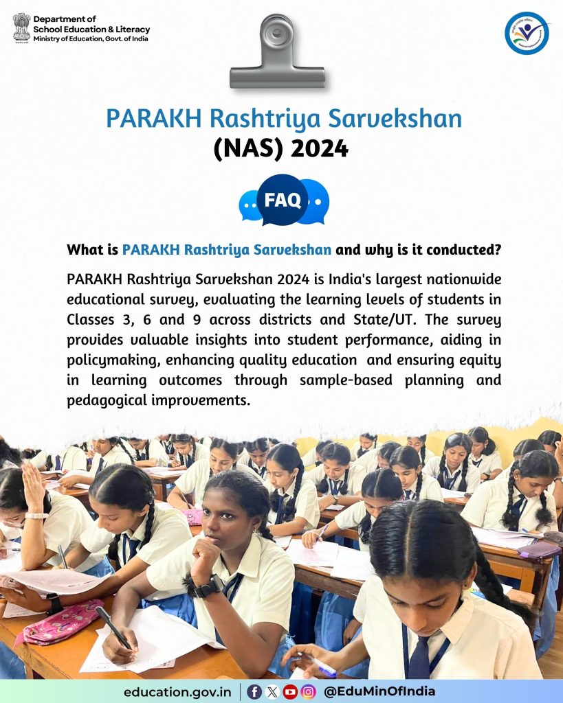 समग्र विकास के लिए छात्रों के ज्ञान का आकलन करने वाला राष्ट्रीय सर्वेक्षण, जिसे पहले राष्ट्रीय उपलब्धि सर्वेक्षण (NAS) कहा जाता था पिछले साल 4 दिसंबर को आयोजित किया गया था। इसमें 36 राज्यों और केंद्र शासित प्रदेशों (यूटी) के 781 जिलों के 74,229 स्कूलों के कक्षा 3, 6 और 9 के सरकारी और निजी स्कूलों के 21,15,022 छात्रों को शामिल किया गया था।