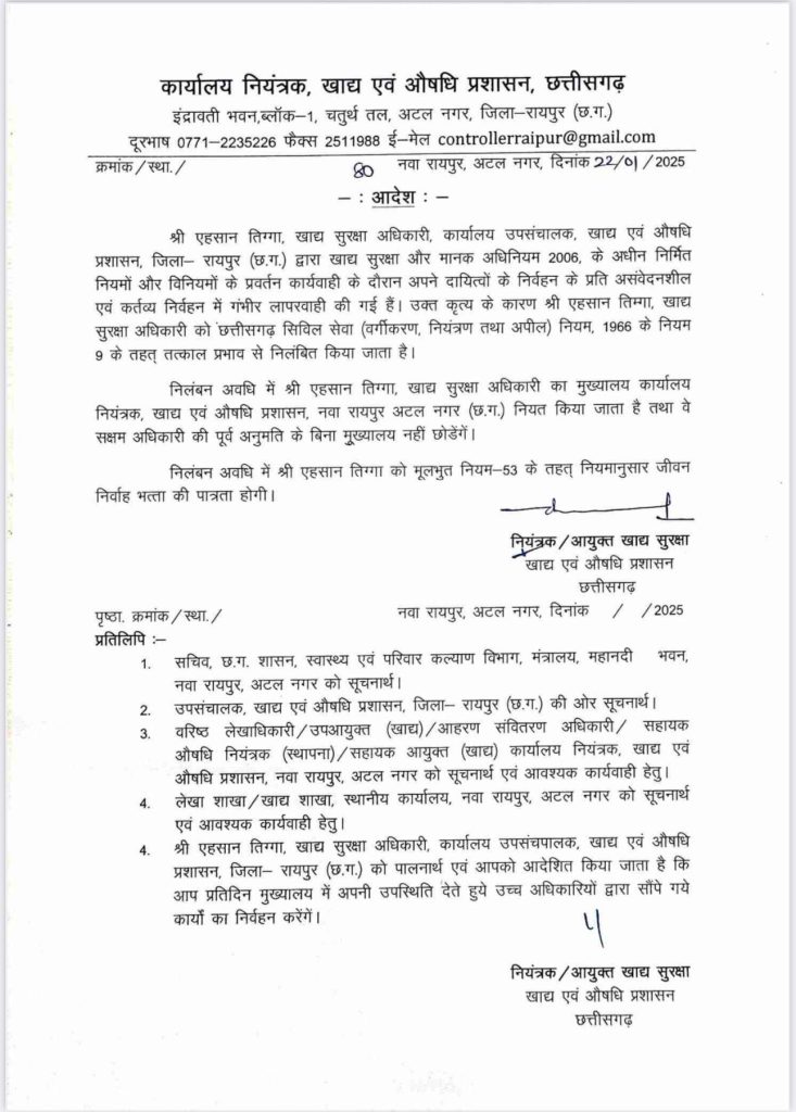 बता दें कि खाद्य एवं औषधि प्रशासन कार्यालय द्वारा जारी निलंबन आदेश में उल्लेख किया गया है कि रायपुर के खाद्य एवं औषधि प्रशासन के कार्यालय उपसंचालक और खाद्य सुरक्षा अधिकारी एहसान तिग्गा द्वारा खाद्य सुरक्षा और मानक अधिनियम 2006 के अधीन निर्मित नियमों और विनियमों के प्रवर्तन कार्यवाही के दौरान अपने दायित्वों के निर्वहन के प्रति असंवेदनशील और कर्तव्य निर्वहन में गंभीर लापरवाही की गई हैं। खाद्य सुरक्षा अधिकारी एहसान तिग्गा को उनके इस कृत्य की वजह से छत्तीसगढ़ सिविल सेवा (वर्गीकरण, नियंत्रण तथा अपील) नियम, 1966 के नियम 9 के तहत् तत्काल प्रभाव से निलंबित किया जाता है।