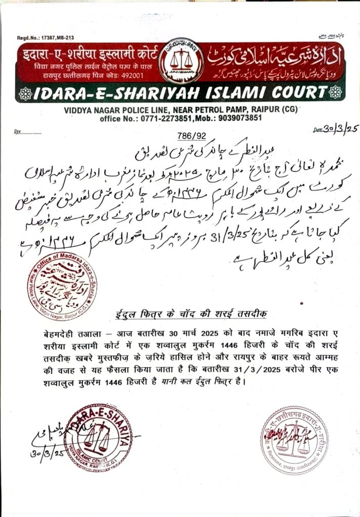 इदारा-ए-शरीया इस्लामी कोर्ट के अनुसार, 30 मार्च 2025 को मगरिब की नमाज के बाद एक शव्वाल 1446 हिजरी के चांद की पुष्टि हुई। रायपुर समेत देश के अन्य हिस्सों में भी चांद दिखने की खबरें आईं, जिसके बाद यह फैसला किया गया कि 31 मार्च को ईद मनाई जाएगी। इससे पहले सऊदी अरब में 29 मार्च को ईद का चांद दिखा था, जिसके बाद आज वहां ईद मनाई गई।
