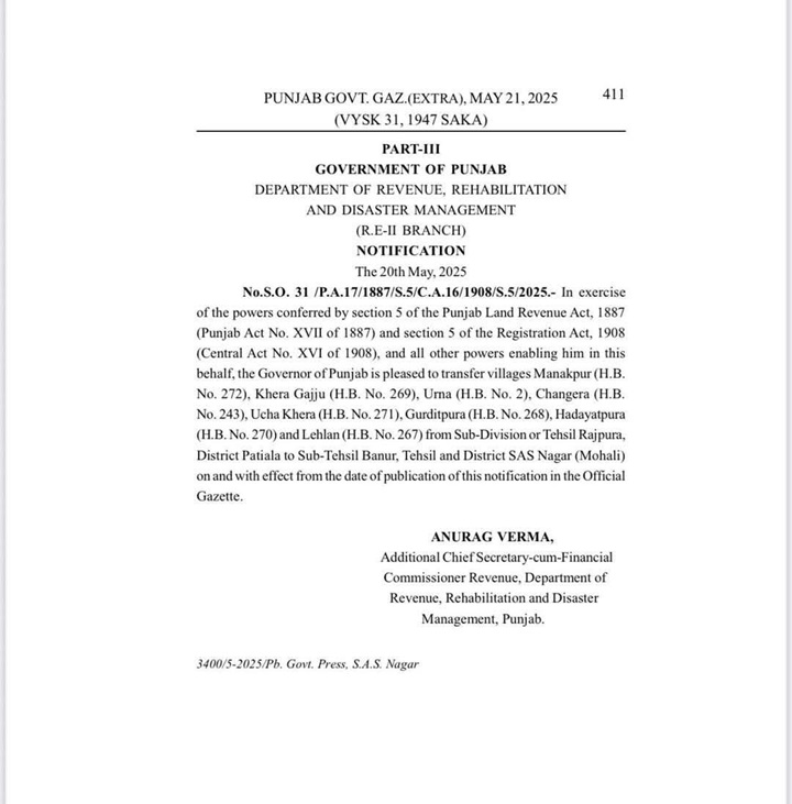 नोटिफिकेशन के अनुसार पटियाला के गांव मानकपुर, लेहलां, गुरदितपुरा (नत्तियां), ऊंचा खेड़ा, खेड़ा गज्जू, हदाइतपुरा, उरना और चेंगरा मोहाली में शामिल हो गए है।