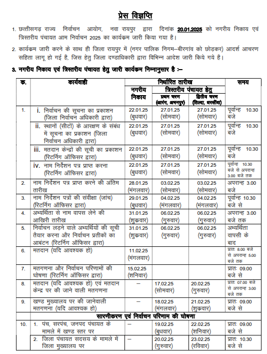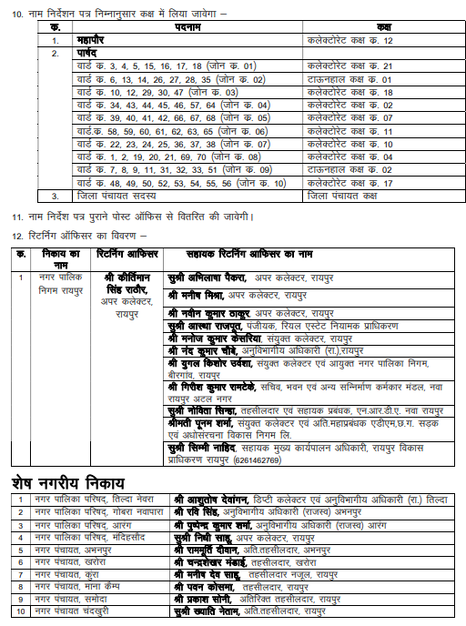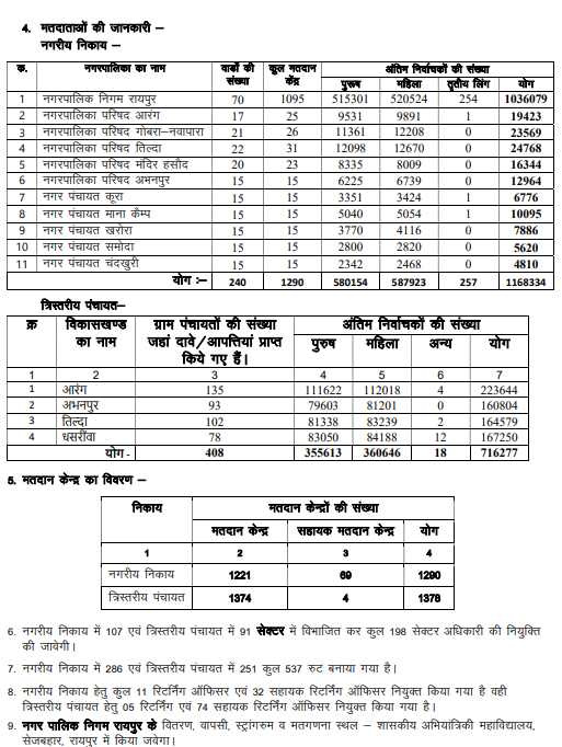 नगरीय निकाय को 107 और त्रिस्तरीय पंचायत को 97 सेक्टरों में बाटा गया है. वहीं मतदाता संख्या की बात करें तो रायपुर नगर निगम में कुल 10 लाख 36 हजार 79 मतदाता वोट डालेंगे. नगरीय निकाय चुनाव में 11 रिटर्निंग ऑफिसर होंगे. वहीं पंचायत में 5 रिटर्निंग और 74 सहायक रिटर्निंग ऑफिसर नियुक्त किए गए हैं.