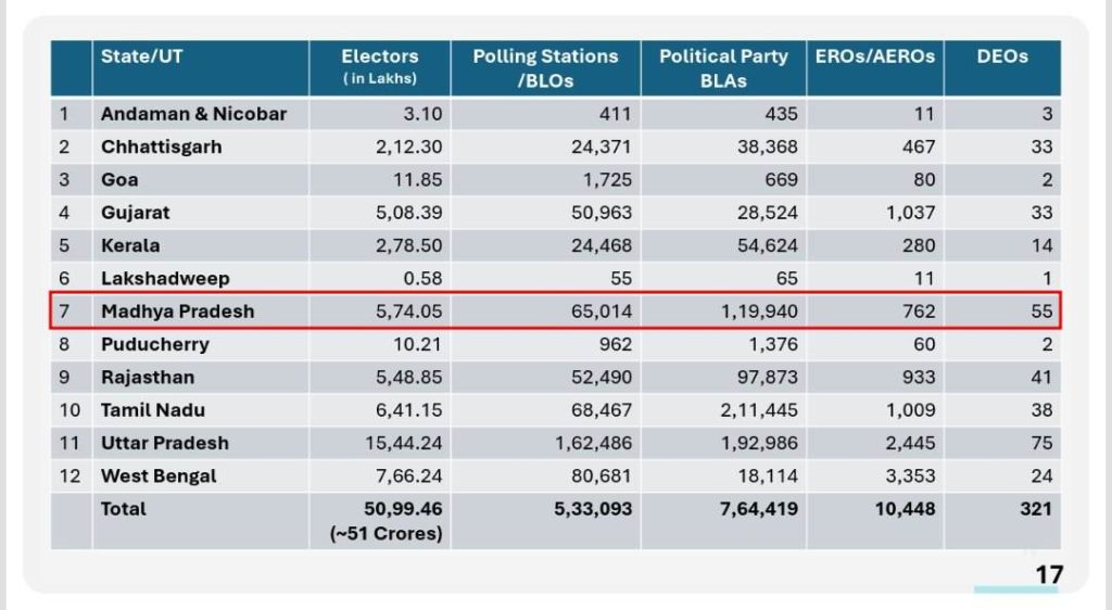 शब्बीर अहमद,भोपाल। चुनाव आयोग ने देश के 12 राज्यों और UT में विशेष गहन पुनरीक्षण (Special Intensive Review) के दूसरे चरण का ऐलान कर दिया है। 12 राज्यों में मध्य प्रदेश का नाम भी शामिल है। चुनाव आयोग ने एमपी के 65 हजार 14 बूथों पर ‘एसआईआर’ की घोषणा की है। जिसमें 1 लाख 19 हजार 40 BLO घर-घर जाकर फॉर्म भरवाएंगे। यह प्रक्रिया 4 नवंबर से शुरू होगी जो 4 दिसंबर तक चलेगी।