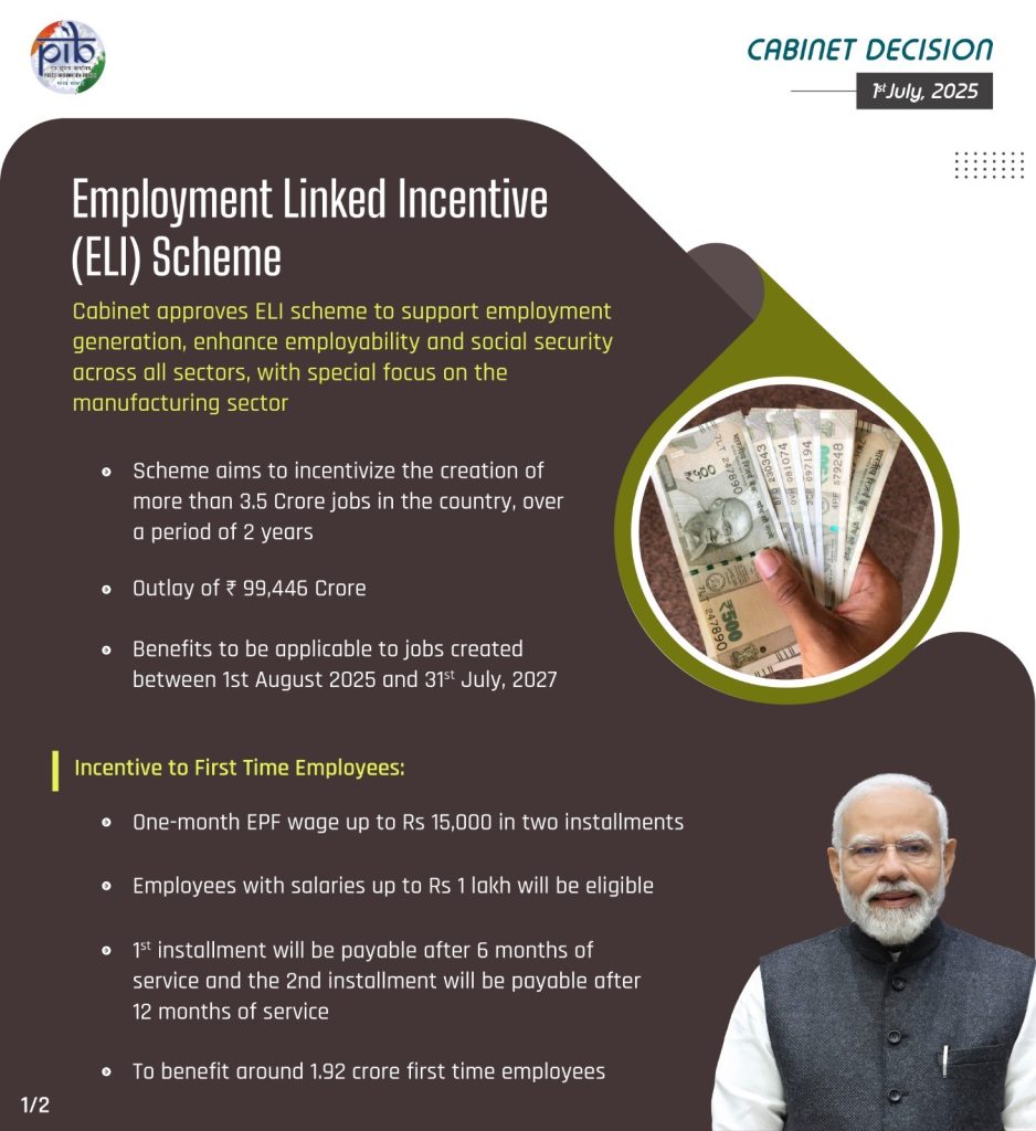 Employment Linked Incentive: रोजगार या नौकरी (JOB) का इंतजार कर रहे लोगों के लिए गुड न्यूज आई है। पीएम नरेंद्र मोदी की अगुवाई वाली केंद्रीय कैबिनेट ने 1 जुलाई (मंगलवार) को बजट में प्रस्तावित बहुप्रतीक्षित रोजगार-लिंक्ड प्रोत्साहन (ईएलआई) योजना को मंजूरी दे दी। इस ELI स्कीम (ELI Scheme) का मकसद 1.07 लाख करोड़ रुपये के परिव्यय के साथ 3.5 करोड़ से अधिक नौकरियां पैदा करना और औपचारिक रोजगार को बढ़ावा देना है। इस स्कीम से कपड़ा, पर्यटन, विनिर्माण और निर्माण जैसेइस स्कीम के तहत निजी क्षेत्र की नौकरियों में नए लोगों को एक महीने का वेतन दिया जाएगा, जबकि उन्हें काम पर रखने वाली फर्मों को वित्तीय प्रोत्साहन मिलेगा। यह कदम नौकरी के अवसरों को बढ़ाने और कामकाजी उम्र के लोगों के कौशल को बढ़ाने के उद्देश्य से उठाया गया है। इस स्कीम का लाभ अगले महीने एक अगस्त 2025 से 31 जुलाई 2027 के बीच सृजित नौकरियों पर लागू होगा।
