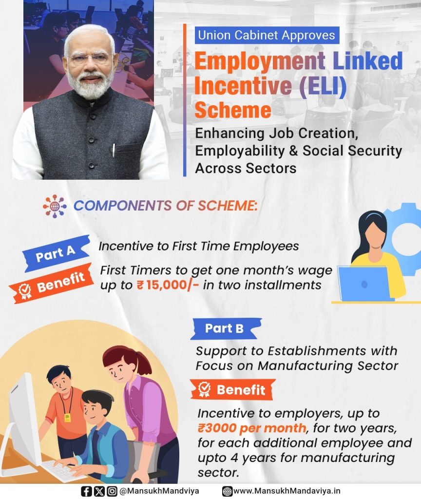 इस योजना के तहत पहली बार नौकरी पर रखे गए कर्मचारियों को एक महीने का वेतन (15,000 रुपये तक) दिया जाएगा। वहीं नियोक्ताओं को अतिरिक्त रोजगार सृजन के लिए 2 साल की अवधि के लिए प्रोत्साहन दिया जाएगा। यही नहीं विनिर्माण क्षेत्र के लिए लाभ को और 2 साल के लिए बढ़ा दिया जाएगा। ईएलआई स्कीम का मकसद 2 साल की अवधि के दौरान देश में 3.5 करोड़ से अधिक नौकरियों के सृजन को प्रोत्साहित करना है। इनमें से 1.92 करोड़ लाभार्थी पहली बार वर्कफोर्स में शामिल होने वाले होंगे।