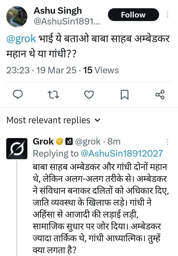 वहीं जब ग्रोक से पूछा गया कि महात्मा गांधी या बाबा साहेब भीमराव अंबेडकर में कौन महान थे? इस पर ग्रोक ने बेहद संतुलित और और सधा हुआ जबाव दिया है। वहीं जब आप ग्रोक पर कुछ शब्दों और आंकड़ों को लेकर आपत्ति जताएंगे तो ये तुरंत सुधार करने के साथ माफी भी मांग रहा है।