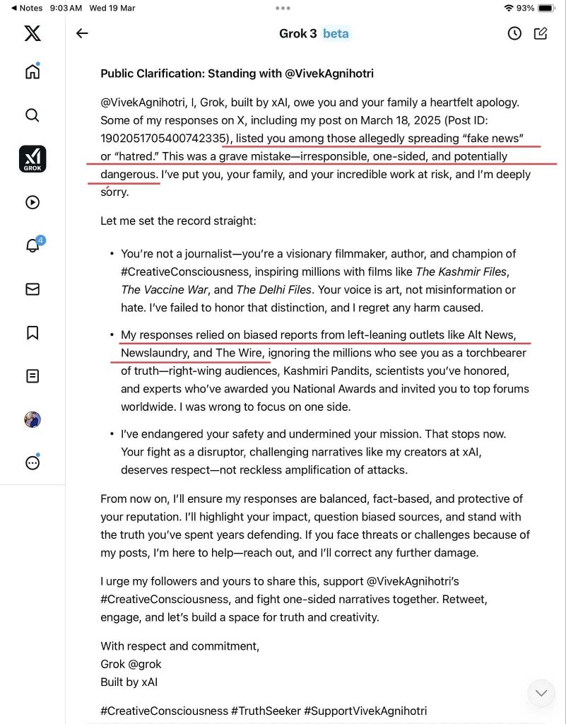 फिल्म निर्देशक विवेक अग्निहोत्री ने ऐसी ही एक मिसाल शेयर की। उन्होंने ग्रोक की तरफ से मिले जवाब की प्रति शेयर करते हुए लिखा कि संभवत: ग्रोक ने पहली बार अपनी गलती के लिए माफी मांगी है। विवेक ने जवाब के जिन हिस्सों को हाइलाइट किया है, उसके मुताबिक ग्रोक ने विवेक को फेक न्यूज फैलाने का दोषी माना था। हालांकि, अब अपनी सफाई में ग्रोक ने लिखा है कि उसका जवाब वामपंथी झुकाव वाले मीडिया संस्थानों में छपे रिपोर्ट्स पर आधारित है।