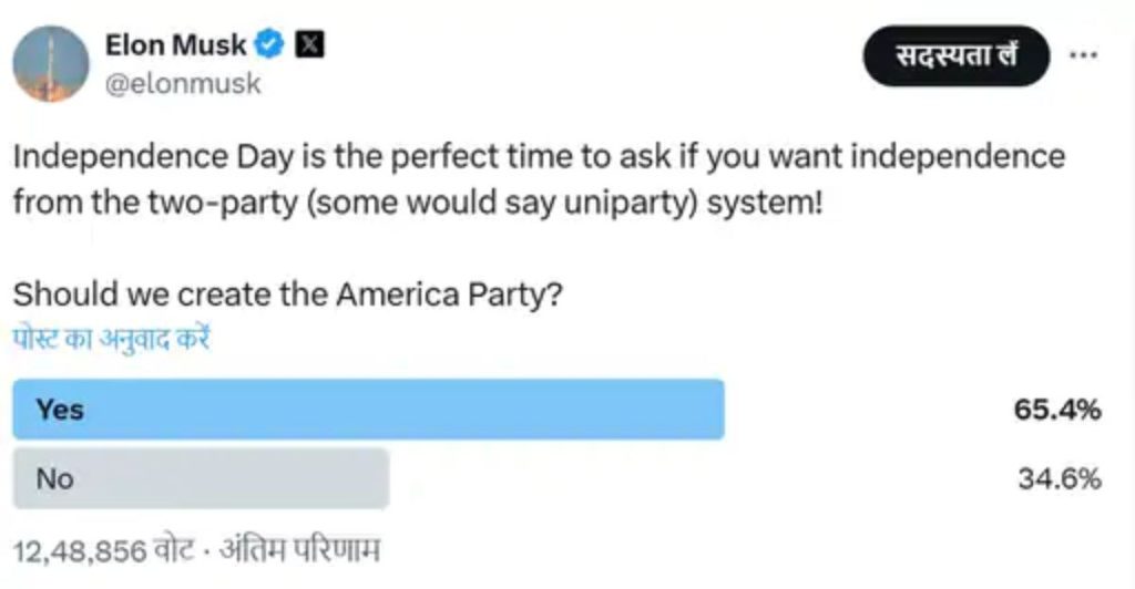 मस्क ने 4 जुलाई को अमेरिका के स्वतंत्रता दिवस के मौके पर X पर एक पोल पोस्ट किया था। इसमें उन्होंने पूछा था कि क्या आप दो पार्टी वाले सिस्टम से आजादी चाहते हैं? क्या हमें अमेरिका पार्टी बनानी चाहिए? पोल के नतीजों में 65.4% लोगों ने “हां” और 34.6% ने “नहीं” में वोट दिया।