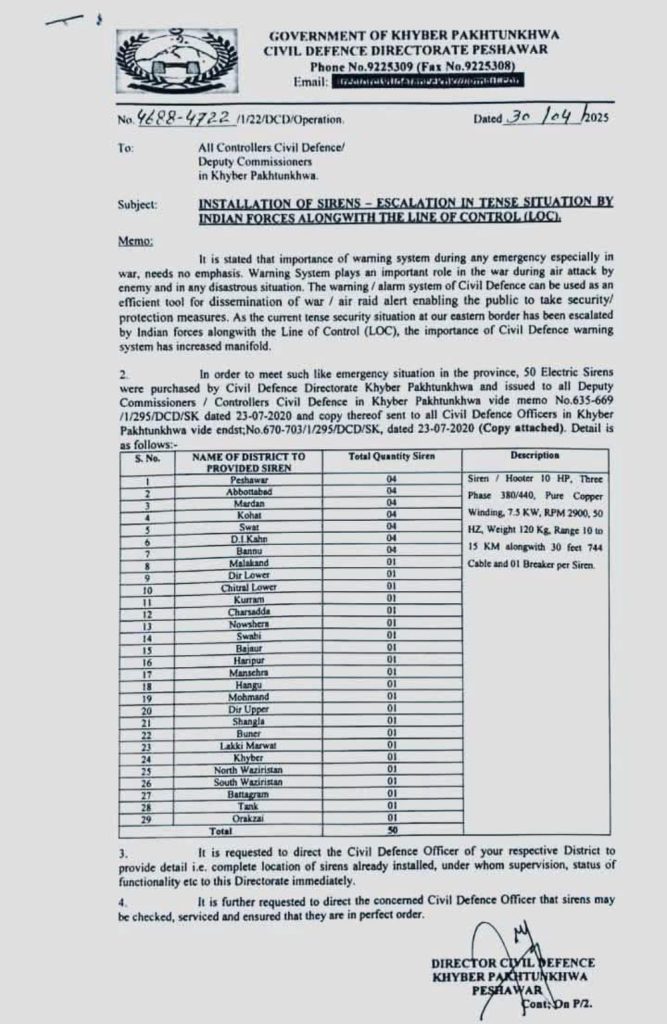 इधर LoC से सैकड़ो किलोमीटर दूर पाकिस्तान के खैबर पख्तूनख्वा (KPK) प्रांत की सरकार ने 29 जिलों में सायरन सिस्टम लगाने का आदेश दिया है। इसमें बड़े शहर पेशावर और एबटाबाद भी शामिल है।