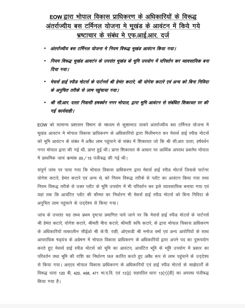 बताया जा रहा है कि बिना टेंडर गलत तरीके से बीडीए के अफसरों ने हेमंत कटारे की कंपनी को प्लॉट आवंटित किया और कमर्शियल इस्तेमाल की अनुमति देने का मामले में FIR दर्ज की गई। भूमि आवंटन से संबंधित शिकायत सी.आर. दत्ता ने की थी। जांच के बाद EOW ने मामला दर्ज किया है।