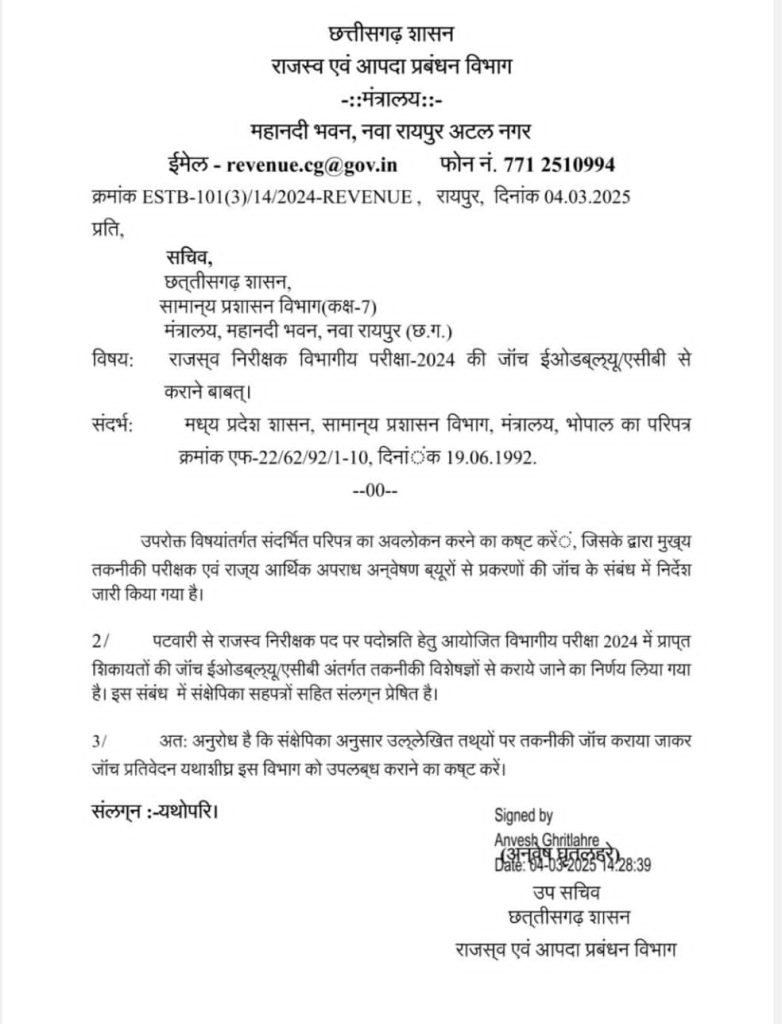 इस मामले में राज्य शासन की ओर से जांच समिति का 23 अगस्त 2024 को गठन हुआ था. इसके बाद अब राजस्व एवं आपदा प्रबंधन विभाग की ओर से सामान्य प्रशासन विभाग के सचिव को पत्र लिखा गया है.