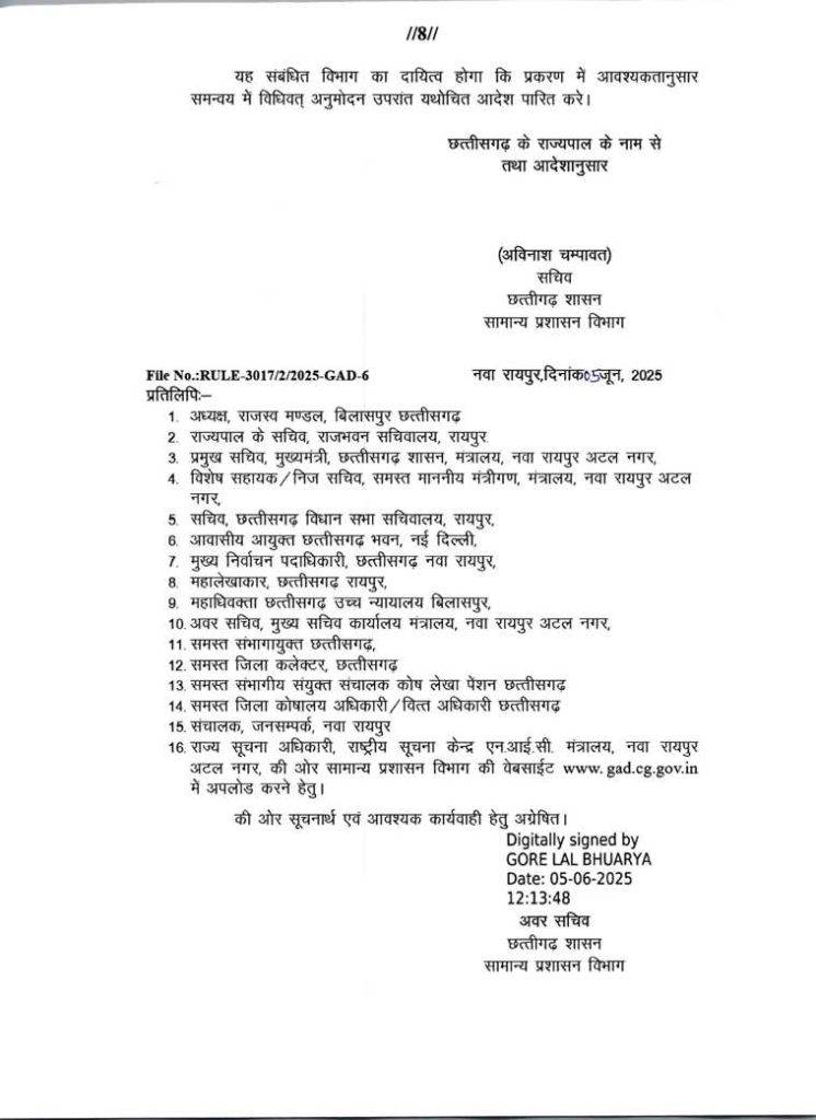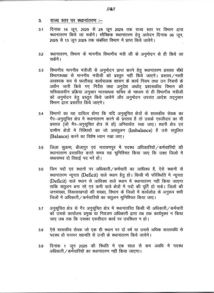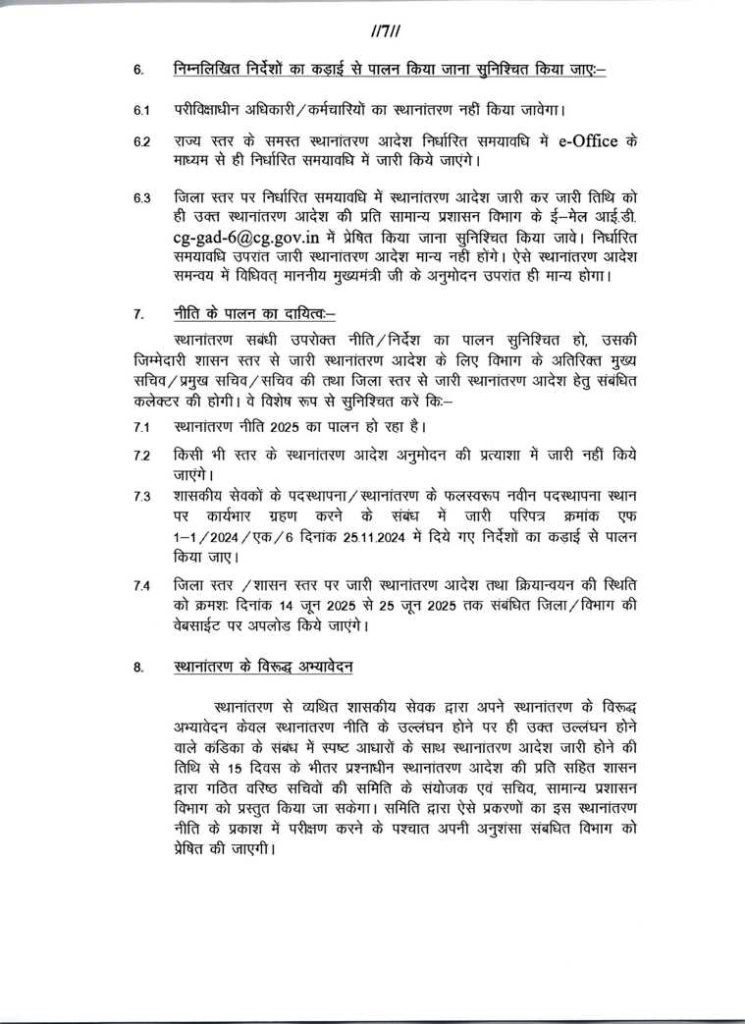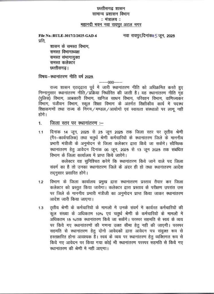 सत्यपाल सिंह राजपूत, रायपुर। साय कैबिनेट की 29वीं बैठक में बुधवार को ट्रांसफर नीति को लेकर बड़ा फैसला लिया गया था. इस फैसले पर अमल करते हुए आज सामान्य प्रशासन विभाग ने स्थानांतरण नीति वर्ष 2025 तमाम विभागाध्यक्षों, संभागायुक्तों और कलेक्टर के लिए जारी भी कर दिया है.
