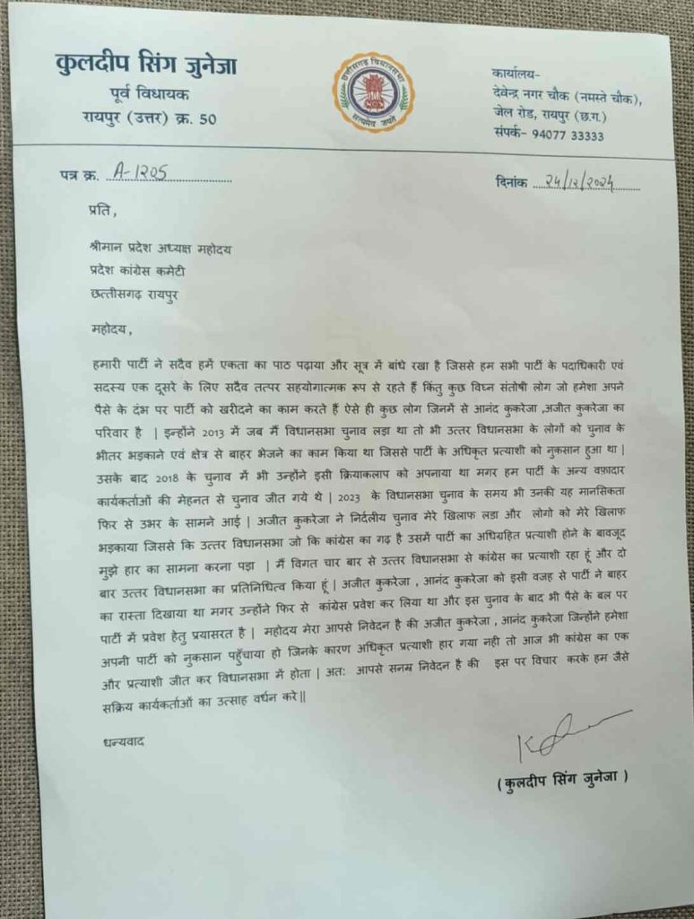 पूर्व विधायक कुलदीप सिंग जुनेजा ने प्रदेश अध्यक्ष दीपक बैज के नाम से लिखे पत्र में कहा कि हमारी पार्टी ने सदैव हमें एकता का पाठ पढ़ाया और सूत्र में बांधे रखा है, लेकिन कुछ विघ्न संतोषी लोग पैसे के दंभ पर पार्टी को खरीदने का काम करते हैं, ऐसे ही कुछ लोग में आनंद कुकरेजा अजीत कुकरेजा का परिवार है.