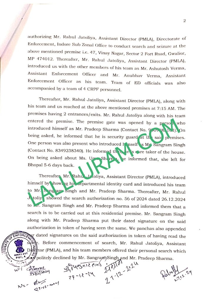 कर्ण मिश्रा , ग्वालियर। पूर्व परिवहन आरक्षक सौरभ शर्मा केस में ED ने शुक्रवार को MP के भोपाल,ग्वालियर जबलपुर में छापामार कार्रवाई की थी। इस दौरान ग्वालियर में ED की कार्रवाई के दौरान तैयार किये गए पंचनामे की एक्सक्लुसिव कॉपी LALLURAM.COM की टीम के पास पहुंची है। जिसमे ED की कार्रवाई के दौरान क्या हुआ ,क्या जब्त किया गया है,सब कुछ साफ हुआ है। ED ने शहर के विनय नगर सेक्टर 2 स्थित सौरभ शर्मा के पुश्तैनी मकान से कई महत्वपूर्ण दस्तावेजों के साथ एक ग्रीन कलर की हैंड रिटन डायरी मिली है, जिसे ED ने अपने पंचनामे में आपत्तिजनक प्रकृति का बताया है।