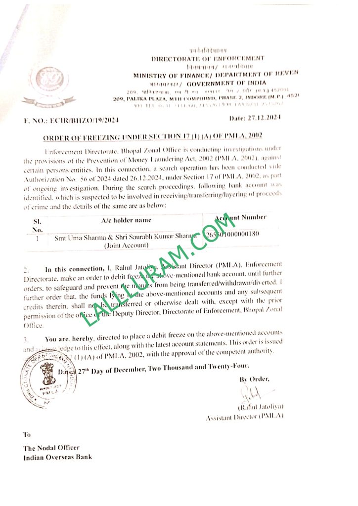 - इंडियन ओवरसीज बैंक में सौरभ शर्मा, उमा शर्मा का जॉइंट एकाउंट मिला है, जिसे फ्रीज कराया गया है।