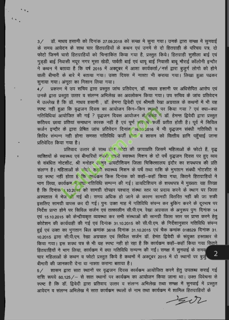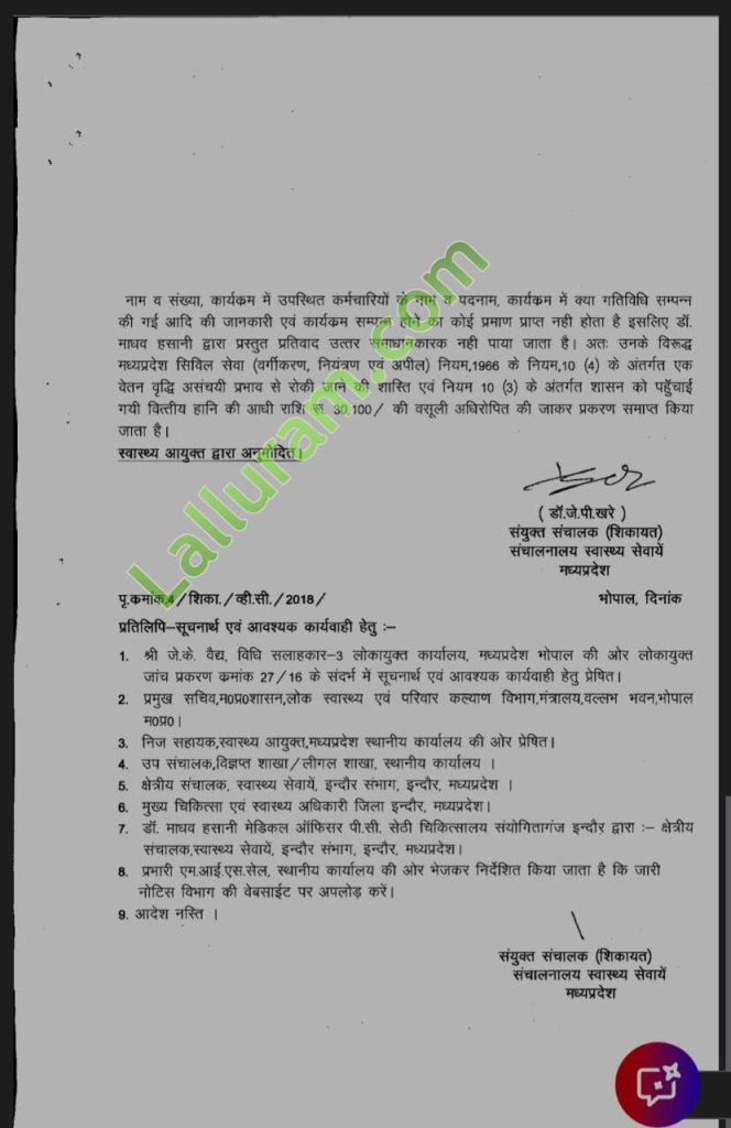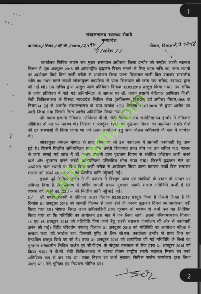 Lalluram.com के पास उपलब्ध सरकारी पत्रों में साफ लिखा है कि डॉ. हसानी पर भ्रष्टाचार साबित हुआ था। उनकी एक वेतन वृद्धि रोकी गई। वेतन से पैसा काटा गया। लोकायुक्त जांच में गड़बड़ी सिद्ध हुई। फिर भी उन्हें प्रमोशन देकर जिले का स्वास्थ्य अधिकारी बना दिया गया।