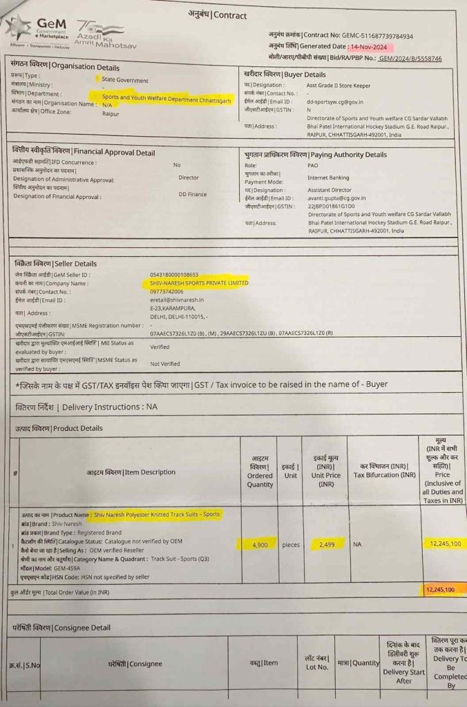 जानकारों के मुताबिक भंडार क्रय नियम के मुताबिक 20 लाख रुपए से अधिक की खरीदी के लिए कम से कम 30 दिनों का टेंडर निकालना जरूरी है, लेकिन खेल विभाग की हड़बड़ी देखिए कि महज 11 दिनों में ही टेंडर की प्रक्रिया पूरी कर ली गई. 29 अक्टूबर 2024 को टेंडर ओपन किया गया और 11 नवंबर 2024 को टेंडर क्लोज कर दिया गया. खेल विभाग ने 14 नवंबर 2024 को ट्रैक सूट सप्लाई करने वाली कंपनी नरेश स्पोर्ट्स प्राइवेट लिमिटेड के साथ अनुबंध कर लिया. वित्त के जानकार बताते हैं कि वित्तीय नियमों में संचालक को 20 लाख रुपए तक ही खरीदी का अधिकार है, लेकिन ट्रैक सूट की खरीदी के लिए किसी तरह की स्वीकृति शासन स्तर पर नहीं ली गई.